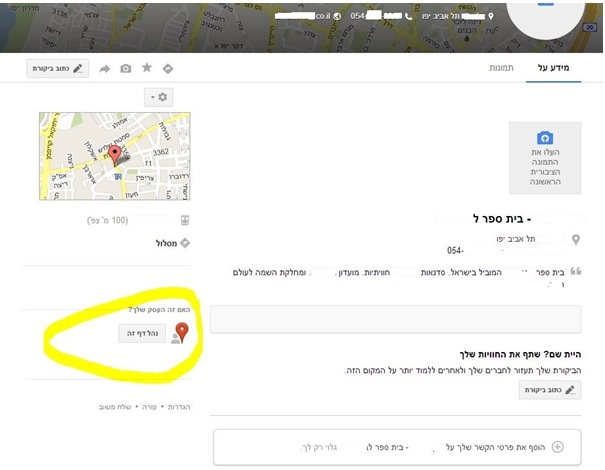 3. בצד שמאל של העמוד (בגרסה העברית, צד ימין לעמודים באנגלית), תחת הכותרת "האם זה העסק שלך"- ללחוץ על הכפתור "נהל דף זה" (ראו מוקף בצהוב בצילום מסך למטה).